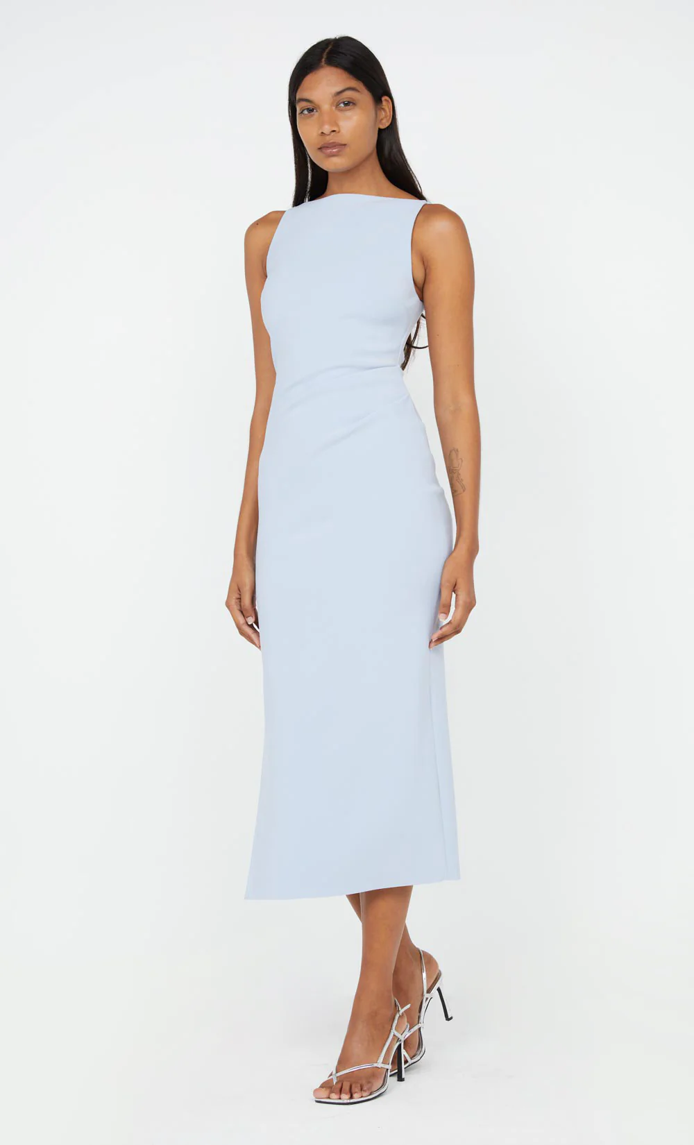 Sleeveless high neck midi in a timeless silhouette that flatters all body shapes. The midi dress is cut from a stretch bonded crepe fabric that cinches in the body and skims the silhouette. The Be Mine Tuck Midi Dress features a slight gathering detail at the waist and hips for a more comfortable fit.