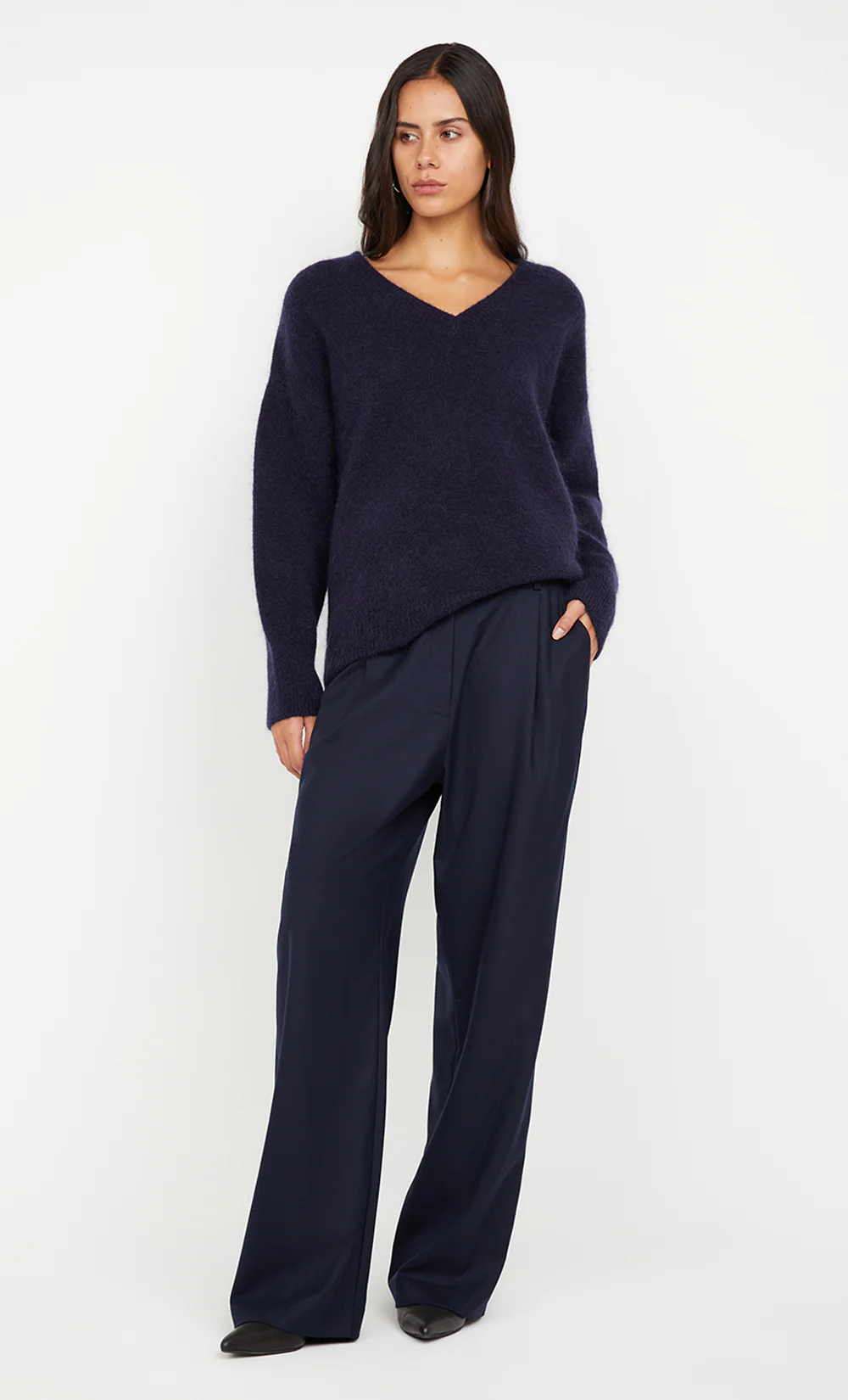The BEC + BRIDGE Campbell V Neck Jumper in Ink is a cosy yet stylish addition to your wardrobe. Made from a mohair blend knit, this jumper features a flattering V neckline and ribbed detailing at the collar and cuffs for added texture. With its relaxed fit and dropped shoulders, it offers a comfortable, laid-back silhouette that’s perfect for layering or wearing on its own. The pull-on styling ensures effortless wear, making it a versatile option for casual looks on cooler days. Styled with BEC + BRIDGE Lyon Pant.