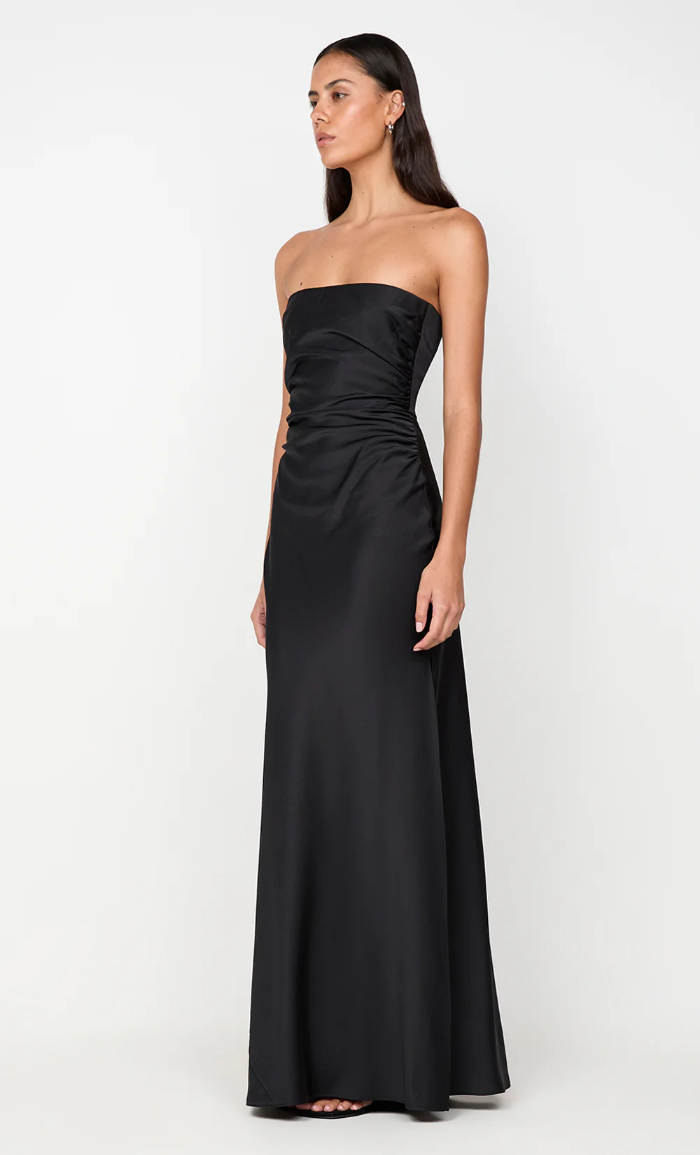The Eternity Strapless Maxi Dress is an elegant and classic style. The dress features ruching at the cinched waist to create a flattering silhouette and falls into a bias cut maxi skirt with side split.
