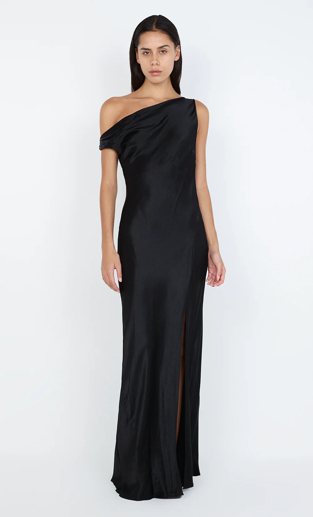 The BEC + BRIDGE Sol Asym Dress in Black is a sophisticated maxi dress with an asymmetrical neckline and bias cut that flatters the figure. Featuring bust darts and a mid-thigh split, it offers a sleek, modern elegance. Finished with a narrow rolled hem and pull-on styling, this dress is perfect as a bridesmaid dress, for special events, or formal occasions. Pair it with the BEC + BRIDGE Kate Heel for a polished, elevated look.