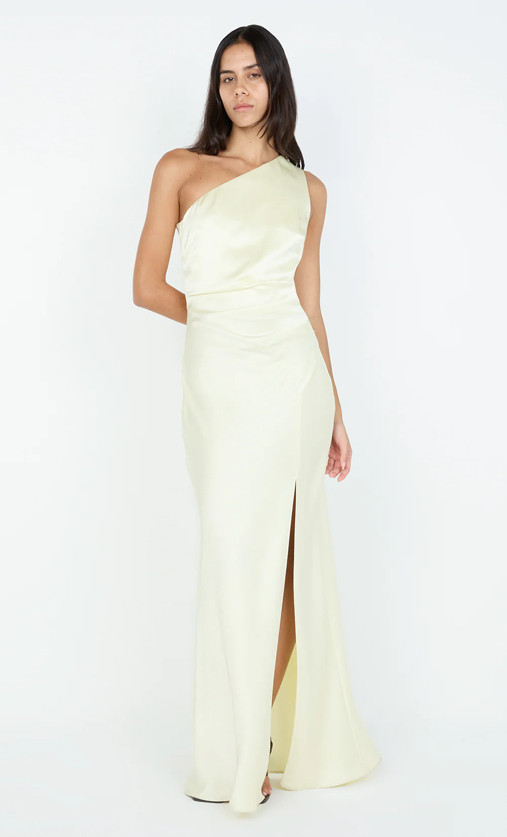The BEC + BRIDGE Dreamer Asym Maxi Dress is a flattering one shoulder maxi dress with asymmetrical neckline, side tuck detailing over the hips and waist, and a statement leg split.