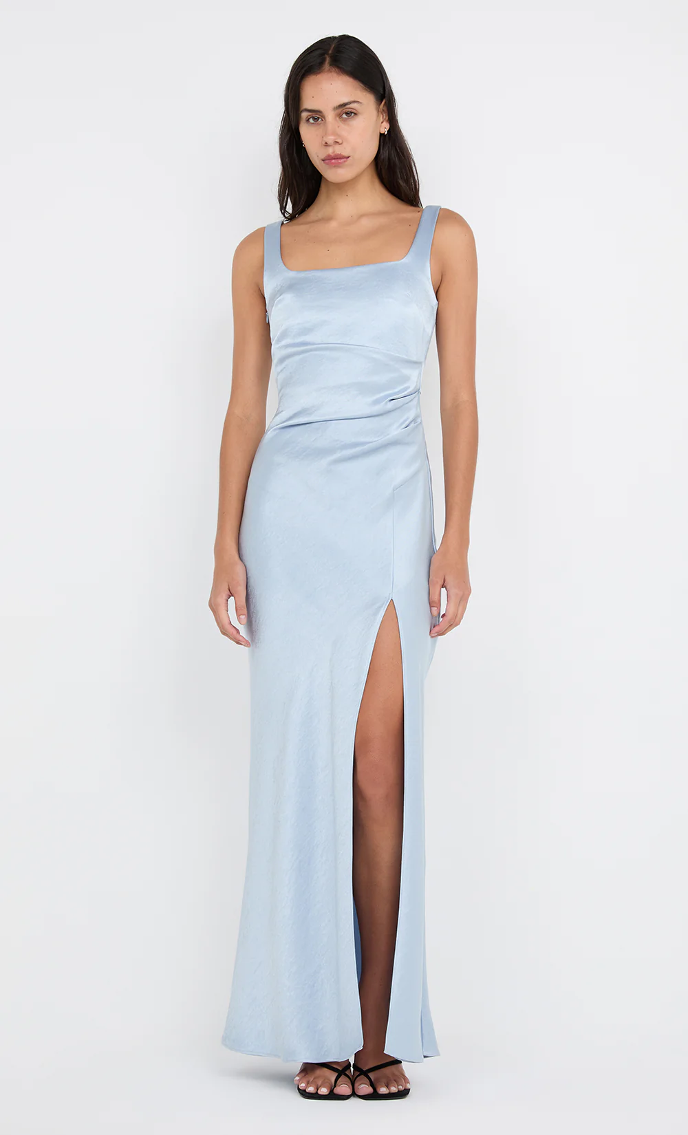 A timeless classic, the Dreamer Square Neck Dress is an easy to wear formal style that flatters all silhouettes. The maxi dress dress features a square neckline and a dramatic side leg split. The gathering detail around the waist and hips disguises any unwanted lines on the body.